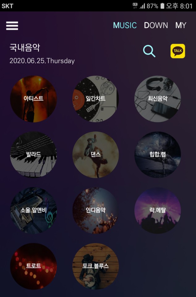 국내음악, 해외음악, 기타음악 각 장르별 실시간 인기 차트를 제공합니다. 또한 듣고싶은 가수, 앨범, 노래를 검색하여 실시간으로 감상 하거나 뮤직비디오를 시청할수 있습니다. 내가 다운로드