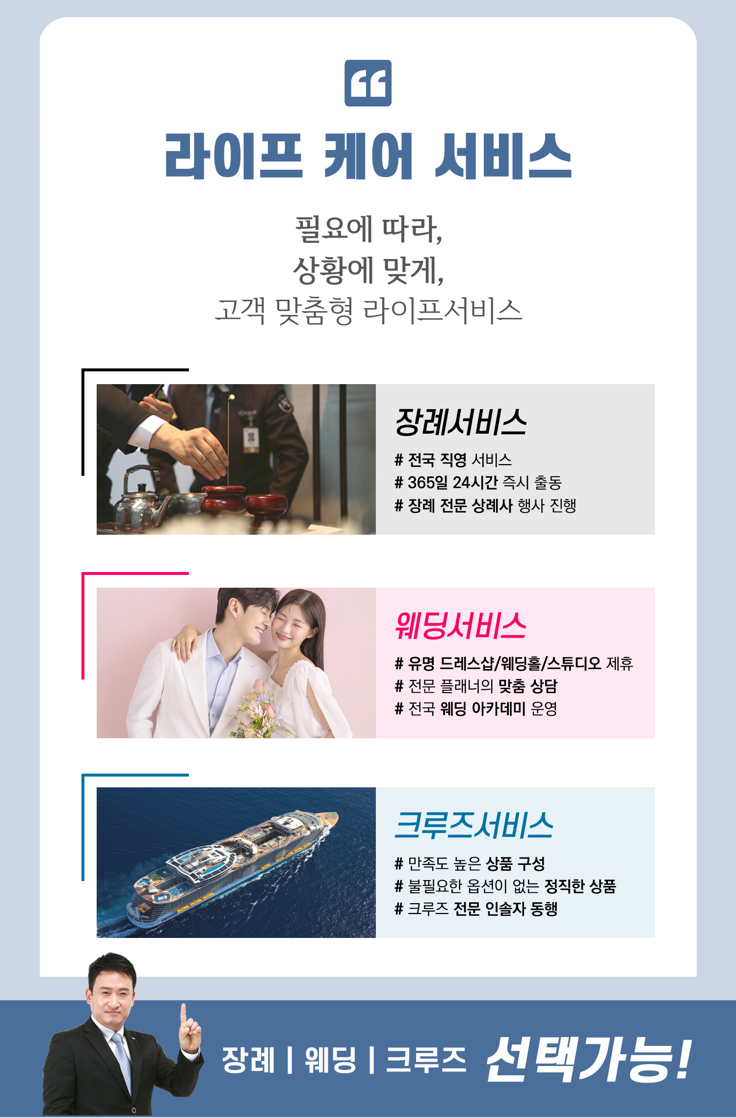 상조가입하면 +가전제품 +장례,웨딩,크루즈여행서비스 선택형 전환이 가능하며 전환서비스를 사용하지 않는경우